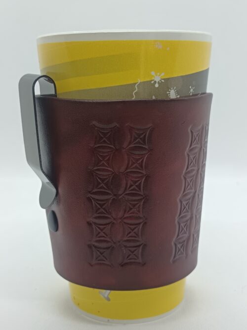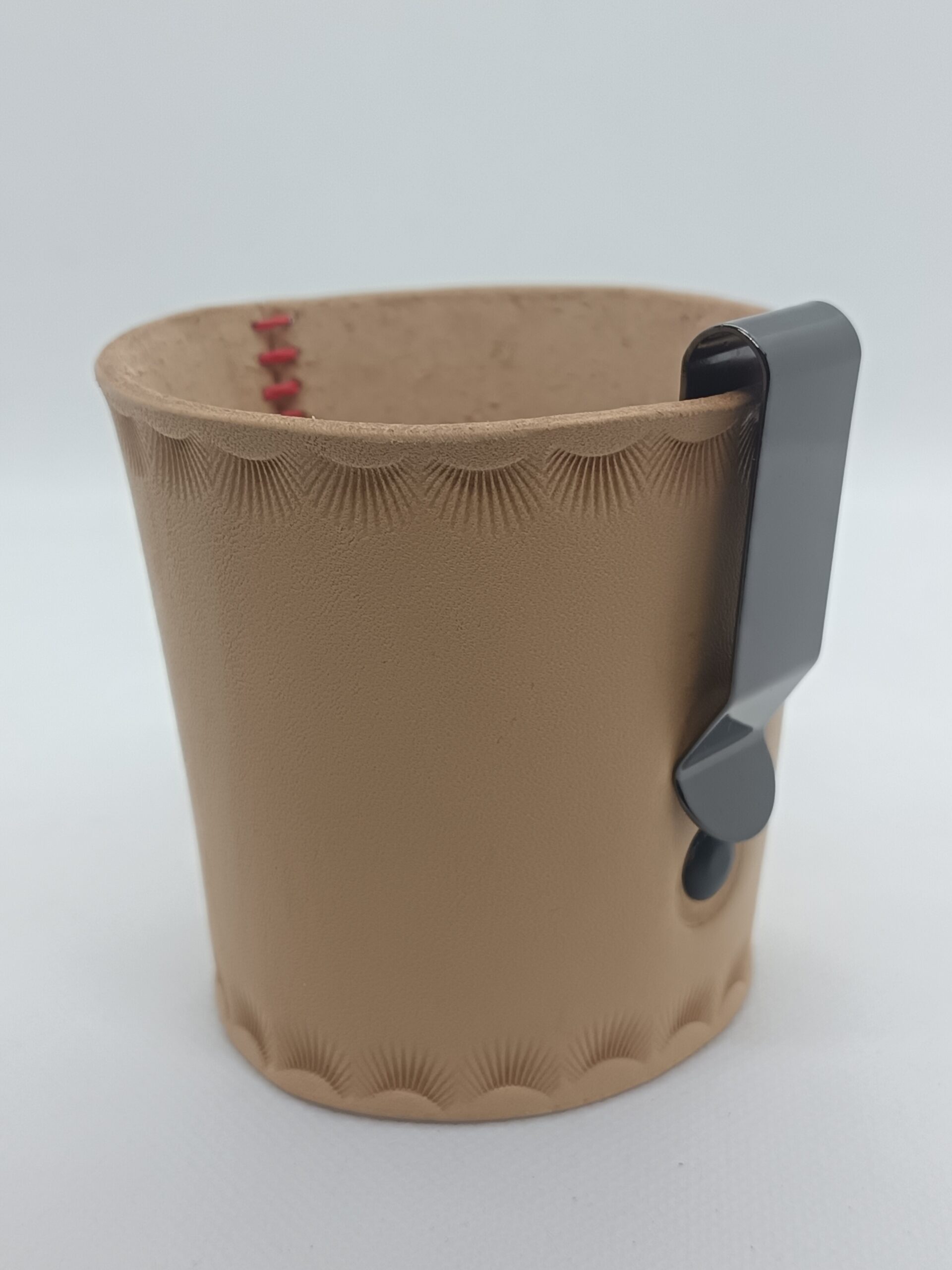 Porte gobelet en cuir tanné végétal, martelé, teinté et protégé. Un clip ceinture permet de profiter de votre gobelet tout en ayant les mains libres.